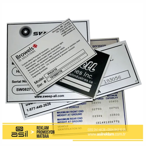Makine plakaları, uyarı levhaları, seri numarası etiketleri ve marka logoları gibi birçok alanda kullanılan